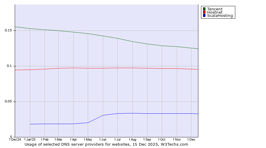 TechnologiesContent ManagementServer-side Languages Client-side Languages JavaScript Libraries CSS Frameworks Web Servers Web Panels Operating Systems Web Hosting Data Centers Reverse Proxies DNS Servers Email Servers SSL Certificate Authorities Content Delivery Traffic Analysis Tools Advertising Networks Tag Managers Social Widgets Site Elements Structured Data Markup Languages Character Encodings Image File Formats Top Level Domains Server Locations Content Languages | Technologies > DNS Servers > Technology usage comparison Comparison of the usage statistics of Tencent vs. Hostnet vs. ScalaHosting for websitesThis report shows the usage statistics of Tencent vs. Hostnet vs. ScalaHosting as DNS server provider on the web. See technologies overview for explanations on the methodologies used in the surveys. Our reports are updated daily. UsageThis diagram shows the percentages of websites using the selected technologies. How to read the diagram: