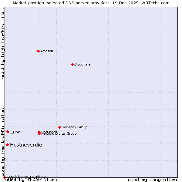 TechnologiesContent ManagementServer-side Languages Client-side Languages JavaScript Libraries CSS Frameworks Web Servers Web Panels Operating Systems Web Hosting Data Centers Reverse Proxies DNS Servers Email Servers SSL Certificate Authorities Content Delivery Traffic Analysis Tools Advertising Networks Tag Managers Social Widgets Site Elements Structured Data Markup Languages Character Encodings Image File Formats Top Level Domains Server Locations Content Languages | Technologies > DNS Servers > Technology usage comparison Comparison of the usage statistics of Lnw vs. Hostneverdie vs. Webhost Python for websitesThis report shows the usage statistics of Lnw vs. Hostneverdie vs. Webhost Python as DNS server provider on the web. See technologies overview for explanations on the methodologies used in the surveys. Our reports are updated daily. UsageThis diagram shows the percentages of websites using the selected technologies. How to read the diagram: