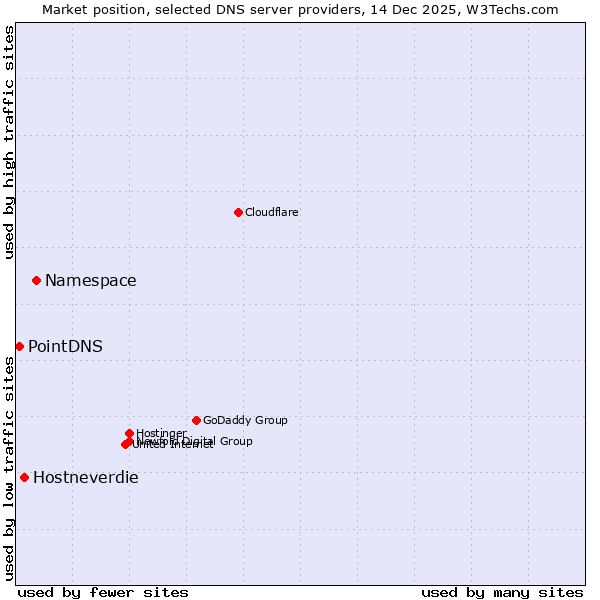 TechnologiesContent ManagementServer-side Languages Client-side Languages JavaScript Libraries CSS Frameworks Web Servers Web Panels Operating Systems Web Hosting Data Centers Reverse Proxies DNS Servers Email Servers SSL Certificate Authorities Content Delivery Traffic Analysis Tools Advertising Networks Tag Managers Social Widgets Site Elements Structured Data Markup Languages Character Encodings Image File Formats Top Level Domains Server Locations Content Languages | Technologies > DNS Servers > Technology usage comparison Comparison of the usage statistics of Namespace vs. Hostneverdie vs. PointDNS for websitesThis report shows the usage statistics of Namespace vs. Hostneverdie vs. PointDNS as DNS server provider on the web. See technologies overview for explanations on the methodologies used in the surveys. Our reports are updated daily. UsageThis diagram shows the percentages of websites using the selected technologies. How to read the diagram: