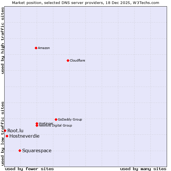 TechnologiesContent ManagementServer-side Languages Client-side Languages JavaScript Libraries CSS Frameworks Web Servers Web Panels Operating Systems Web Hosting Data Centers Reverse Proxies DNS Servers Email Servers SSL Certificate Authorities Content Delivery Traffic Analysis Tools Advertising Networks Tag Managers Social Widgets Site Elements Structured Data Markup Languages Character Encodings Image File Formats Top Level Domains Server Locations Content Languages | Technologies > DNS Servers > Technology usage comparison Comparison of the usage statistics of Squarespace vs. Hostneverdie vs. Root.lu for websitesThis report shows the usage statistics of Squarespace vs. Hostneverdie vs. Root.lu as DNS server provider on the web. See technologies overview for explanations on the methodologies used in the surveys. Our reports are updated daily. UsageThis diagram shows the percentages of websites using the selected technologies. How to read the diagram: