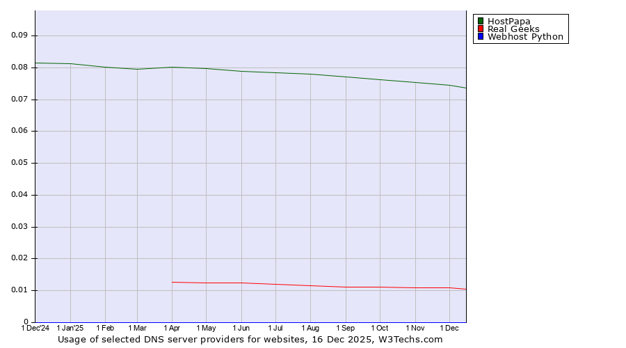 TechnologiesContent ManagementServer-side Languages Client-side Languages JavaScript Libraries CSS Frameworks Web Servers Web Panels Operating Systems Web Hosting Data Centers Reverse Proxies DNS Servers Email Servers SSL Certificate Authorities Content Delivery Traffic Analysis Tools Advertising Networks Tag Managers Social Widgets Site Elements Structured Data Markup Languages Character Encodings Image File Formats Top Level Domains Server Locations Content Languages | Technologies > DNS Servers > Technology usage comparison Comparison of the usage statistics of HostPapa vs. Real Geeks vs. Webhost Python for websitesThis report shows the usage statistics of HostPapa vs. Real Geeks vs. Webhost Python as DNS server provider on the web. See technologies overview for explanations on the methodologies used in the surveys. Our reports are updated daily. UsageThis diagram shows the percentages of websites using the selected technologies. How to read the diagram: