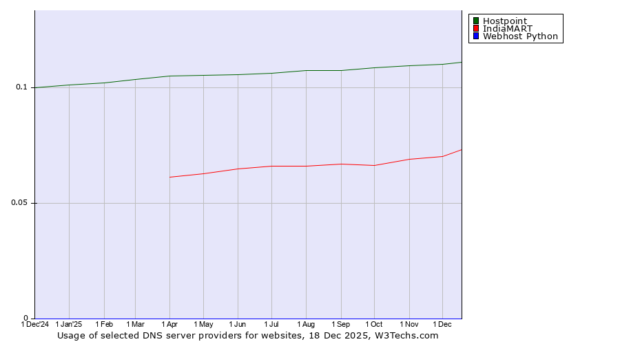 TechnologiesContent ManagementServer-side Languages Client-side Languages JavaScript Libraries CSS Frameworks Web Servers Web Panels Operating Systems Web Hosting Data Centers Reverse Proxies DNS Servers Email Servers SSL Certificate Authorities Content Delivery Traffic Analysis Tools Advertising Networks Tag Managers Social Widgets Site Elements Structured Data Markup Languages Character Encodings Image File Formats Top Level Domains Server Locations Content Languages | Technologies > DNS Servers > Technology usage comparison Comparison of the usage statistics of Hostpoint vs. IndiaMART vs. Webhost Python for websitesThis report shows the usage statistics of Hostpoint vs. IndiaMART vs. Webhost Python as DNS server provider on the web. See technologies overview for explanations on the methodologies used in the surveys. Our reports are updated daily. UsageThis diagram shows the percentages of websites using the selected technologies. How to read the diagram: