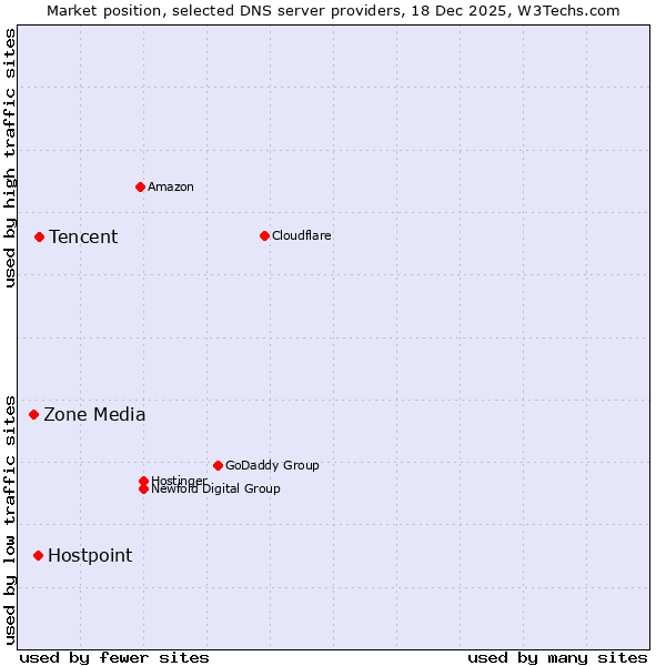 TechnologiesContent ManagementServer-side Languages Client-side Languages JavaScript Libraries CSS Frameworks Web Servers Web Panels Operating Systems Web Hosting Data Centers Reverse Proxies DNS Servers Email Servers SSL Certificate Authorities Content Delivery Traffic Analysis Tools Advertising Networks Tag Managers Social Widgets Site Elements Structured Data Markup Languages Character Encodings Image File Formats Top Level Domains Server Locations Content Languages | Technologies > DNS Servers > Technology usage comparison Comparison of the usage statistics of Tencent vs. Hostpoint vs. Zone Media for websitesThis report shows the usage statistics of Tencent vs. Hostpoint vs. Zone Media as DNS server provider on the web. See technologies overview for explanations on the methodologies used in the surveys. Our reports are updated daily. UsageThis diagram shows the percentages of websites using the selected technologies. How to read the diagram: