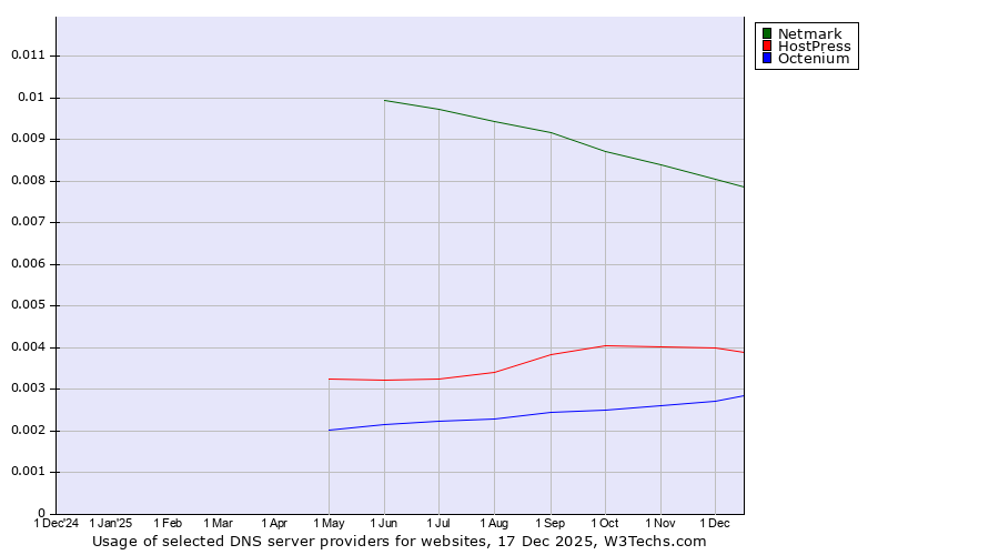 TechnologiesContent ManagementServer-side Languages Client-side Languages JavaScript Libraries CSS Frameworks Web Servers Web Panels Operating Systems Web Hosting Data Centers Reverse Proxies DNS Servers Email Servers SSL Certificate Authorities Content Delivery Traffic Analysis Tools Advertising Networks Tag Managers Social Widgets Site Elements Structured Data Markup Languages Character Encodings Image File Formats Top Level Domains Server Locations Content Languages | Technologies > DNS Servers > Technology usage comparison Comparison of the usage statistics of Netmark vs. HostPress vs. Octenium for websitesThis report shows the usage statistics of Netmark vs. HostPress vs. Octenium as DNS server provider on the web. See technologies overview for explanations on the methodologies used in the surveys. Our reports are updated daily. UsageThis diagram shows the percentages of websites using the selected technologies. How to read the diagram: