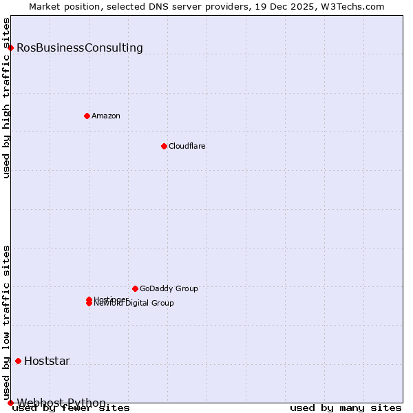 TechnologiesContent ManagementServer-side Languages Client-side Languages JavaScript Libraries CSS Frameworks Web Servers Web Panels Operating Systems Web Hosting Data Centers Reverse Proxies DNS Servers Email Servers SSL Certificate Authorities Content Delivery Traffic Analysis Tools Advertising Networks Tag Managers Social Widgets Site Elements Structured Data Markup Languages Character Encodings Image File Formats Top Level Domains Server Locations Content Languages | Technologies > DNS Servers > Technology usage comparison Comparison of the usage statistics of Hoststar vs. RosBusinessConsulting vs. Webhost Python for websitesThis report shows the usage statistics of Hoststar vs. RosBusinessConsulting vs. Webhost Python as DNS server provider on the web. See technologies overview for explanations on the methodologies used in the surveys. Our reports are updated daily. UsageThis diagram shows the percentages of websites using the selected technologies. How to read the diagram: