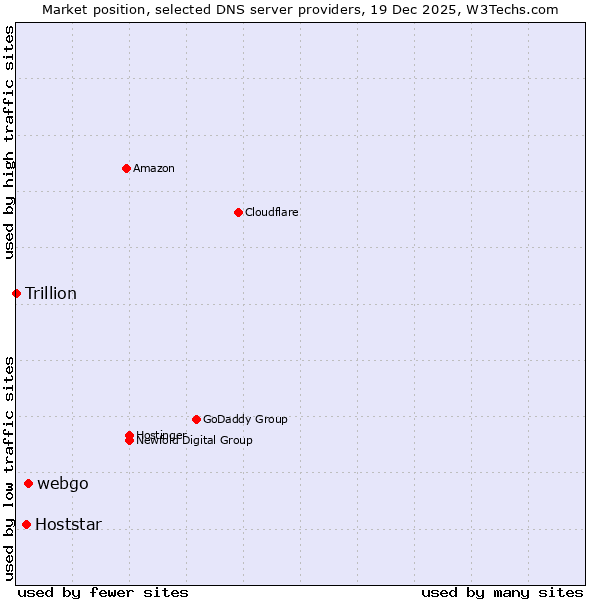 TechnologiesContent ManagementServer-side Languages Client-side Languages JavaScript Libraries CSS Frameworks Web Servers Web Panels Operating Systems Web Hosting Data Centers Reverse Proxies DNS Servers Email Servers SSL Certificate Authorities Content Delivery Traffic Analysis Tools Advertising Networks Tag Managers Social Widgets Site Elements Structured Data Markup Languages Character Encodings Image File Formats Top Level Domains Server Locations Content Languages | Technologies > DNS Servers > Technology usage comparison Comparison of the usage statistics of webgo vs. Hoststar vs. Trillion for websitesThis report shows the usage statistics of webgo vs. Hoststar vs. Trillion as DNS server provider on the web. See technologies overview for explanations on the methodologies used in the surveys. Our reports are updated daily. UsageThis diagram shows the percentages of websites using the selected technologies. How to read the diagram: