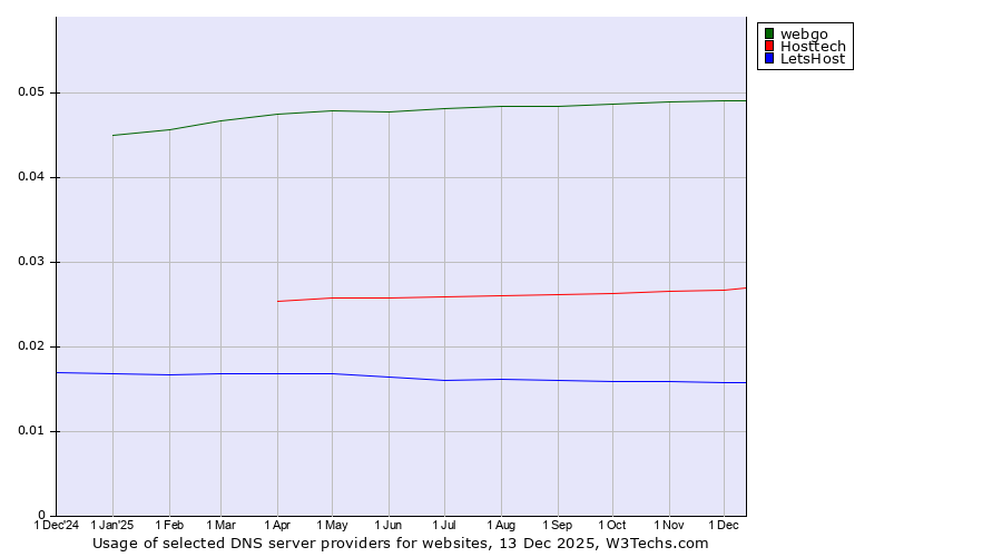 TechnologiesContent ManagementServer-side Languages Client-side Languages JavaScript Libraries CSS Frameworks Web Servers Web Panels Operating Systems Web Hosting Data Centers Reverse Proxies DNS Servers Email Servers SSL Certificate Authorities Content Delivery Traffic Analysis Tools Advertising Networks Tag Managers Social Widgets Site Elements Structured Data Markup Languages Character Encodings Image File Formats Top Level Domains Server Locations Content Languages | Technologies > DNS Servers > Technology usage comparison Comparison of the usage statistics of webgo vs. Hosttech vs. LetsHost for websitesThis report shows the usage statistics of webgo vs. Hosttech vs. LetsHost as DNS server provider on the web. See technologies overview for explanations on the methodologies used in the surveys. Our reports are updated daily. UsageThis diagram shows the percentages of websites using the selected technologies. How to read the diagram: