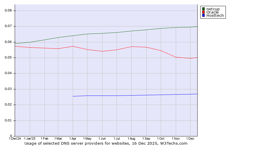 TechnologiesContent ManagementServer-side Languages Client-side Languages JavaScript Libraries CSS Frameworks Web Servers Web Panels Operating Systems Web Hosting Data Centers Reverse Proxies DNS Servers Email Servers SSL Certificate Authorities Content Delivery Traffic Analysis Tools Advertising Networks Tag Managers Social Widgets Site Elements Structured Data Markup Languages Character Encodings Image File Formats Top Level Domains Server Locations Content Languages | Technologies > DNS Servers > Technology usage comparison Comparison of the usage statistics of netcup vs. Oracle vs. Hosttech for websitesThis report shows the usage statistics of netcup vs. Oracle vs. Hosttech as DNS server provider on the web. See technologies overview for explanations on the methodologies used in the surveys. Our reports are updated daily. UsageThis diagram shows the percentages of websites using the selected technologies. How to read the diagram:
