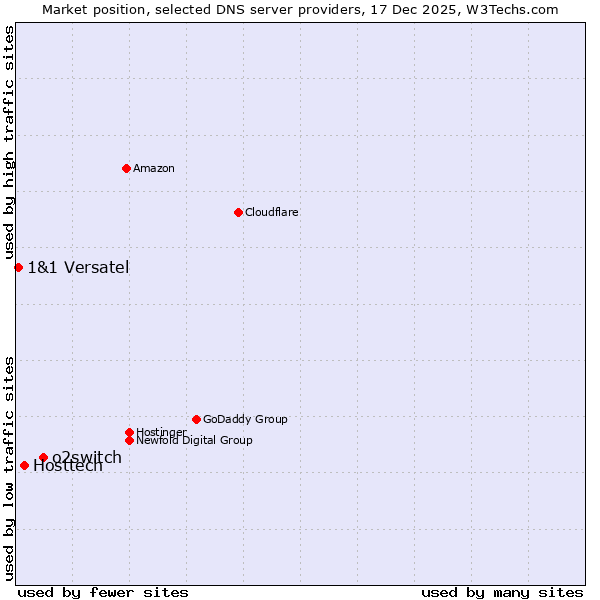 TechnologiesContent ManagementServer-side Languages Client-side Languages JavaScript Libraries CSS Frameworks Web Servers Web Panels Operating Systems Web Hosting Data Centers Reverse Proxies DNS Servers Email Servers SSL Certificate Authorities Content Delivery Traffic Analysis Tools Advertising Networks Tag Managers Social Widgets Site Elements Structured Data Markup Languages Character Encodings Image File Formats Top Level Domains Server Locations Content Languages | Technologies > DNS Servers > Technology usage comparison Comparison of the usage statistics of o2switch vs. Hosttech vs. 1&1 Versatel for websitesThis report shows the usage statistics of o2switch vs. Hosttech vs. 1&1 Versatel as DNS server provider on the web. See technologies overview for explanations on the methodologies used in the surveys. Our reports are updated daily. UsageThis diagram shows the percentages of websites using the selected technologies. How to read the diagram: