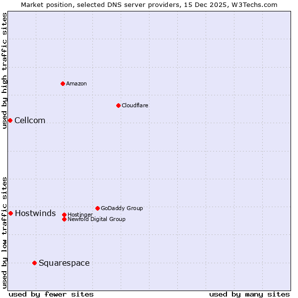 TechnologiesContent ManagementServer-side Languages Client-side Languages JavaScript Libraries CSS Frameworks Web Servers Web Panels Operating Systems Web Hosting Data Centers Reverse Proxies DNS Servers Email Servers SSL Certificate Authorities Content Delivery Traffic Analysis Tools Advertising Networks Tag Managers Social Widgets Site Elements Structured Data Markup Languages Character Encodings Image File Formats Top Level Domains Server Locations Content Languages | Technologies > DNS Servers > Technology usage comparison Comparison of the usage statistics of Squarespace vs. Hostwinds vs. Cellcom for websitesThis report shows the usage statistics of Squarespace vs. Hostwinds vs. Cellcom as DNS server provider on the web. See technologies overview for explanations on the methodologies used in the surveys. Our reports are updated daily. UsageThis diagram shows the percentages of websites using the selected technologies. How to read the diagram: