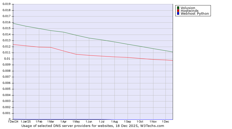 TechnologiesContent ManagementServer-side Languages Client-side Languages JavaScript Libraries CSS Frameworks Web Servers Web Panels Operating Systems Web Hosting Data Centers Reverse Proxies DNS Servers Email Servers SSL Certificate Authorities Content Delivery Traffic Analysis Tools Advertising Networks Tag Managers Social Widgets Site Elements Structured Data Markup Languages Character Encodings Image File Formats Top Level Domains Server Locations Content Languages | Technologies > DNS Servers > Technology usage comparison Comparison of the usage statistics of Volusion vs. Hostwinds vs. Webhost Python for websitesThis report shows the usage statistics of Volusion vs. Hostwinds vs. Webhost Python as DNS server provider on the web. See technologies overview for explanations on the methodologies used in the surveys. Our reports are updated daily. UsageThis diagram shows the percentages of websites using the selected technologies. How to read the diagram:
