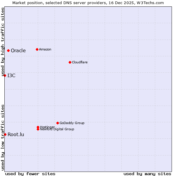 TechnologiesContent ManagementServer-side Languages Client-side Languages JavaScript Libraries CSS Frameworks Web Servers Web Panels Operating Systems Web Hosting Data Centers Reverse Proxies DNS Servers Email Servers SSL Certificate Authorities Content Delivery Traffic Analysis Tools Advertising Networks Tag Managers Social Widgets Site Elements Structured Data Markup Languages Character Encodings Image File Formats Top Level Domains Server Locations Content Languages | Technologies > DNS Servers > Technology usage comparison Comparison of the usage statistics of Oracle vs. Root.lu vs. I3C for websitesThis report shows the usage statistics of Oracle vs. Root.lu vs. I3C as DNS server provider on the web. See technologies overview for explanations on the methodologies used in the surveys. Our reports are updated daily. UsageThis diagram shows the percentages of websites using the selected technologies. How to read the diagram: