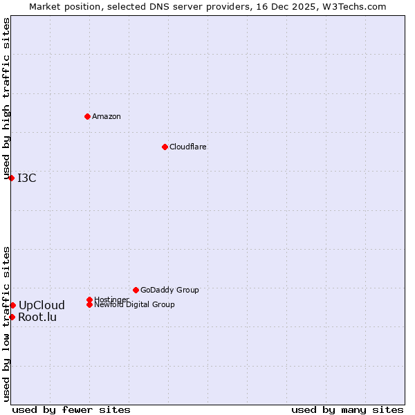 TechnologiesContent ManagementServer-side Languages Client-side Languages JavaScript Libraries CSS Frameworks Web Servers Web Panels Operating Systems Web Hosting Data Centers Reverse Proxies DNS Servers Email Servers SSL Certificate Authorities Content Delivery Traffic Analysis Tools Advertising Networks Tag Managers Social Widgets Site Elements Structured Data Markup Languages Character Encodings Image File Formats Top Level Domains Server Locations Content Languages | Technologies > DNS Servers > Technology usage comparison Comparison of the usage statistics of UpCloud vs. Root.lu vs. I3C for websitesThis report shows the usage statistics of UpCloud vs. Root.lu vs. I3C as DNS server provider on the web. See technologies overview for explanations on the methodologies used in the surveys. Our reports are updated daily. UsageThis diagram shows the percentages of websites using the selected technologies. How to read the diagram: