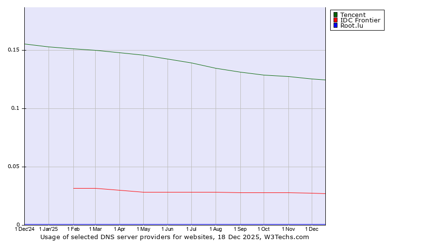TechnologiesContent ManagementServer-side Languages Client-side Languages JavaScript Libraries CSS Frameworks Web Servers Web Panels Operating Systems Web Hosting Data Centers Reverse Proxies DNS Servers Email Servers SSL Certificate Authorities Content Delivery Traffic Analysis Tools Advertising Networks Tag Managers Social Widgets Site Elements Structured Data Markup Languages Character Encodings Image File Formats Top Level Domains Server Locations Content Languages | Technologies > DNS Servers > Technology usage comparison Comparison of the usage statistics of Tencent vs. IDC Frontier vs. Root.lu for websitesThis report shows the usage statistics of Tencent vs. IDC Frontier vs. Root.lu as DNS server provider on the web. See technologies overview for explanations on the methodologies used in the surveys. Our reports are updated daily. UsageThis diagram shows the percentages of websites using the selected technologies. How to read the diagram: