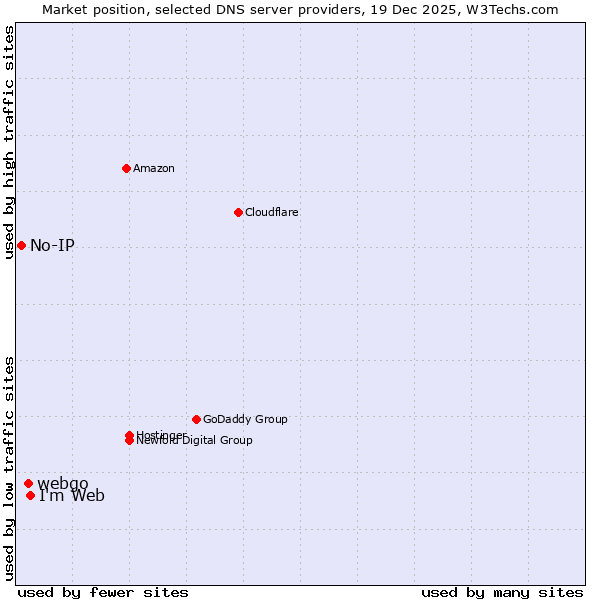 TechnologiesContent ManagementServer-side Languages Client-side Languages JavaScript Libraries CSS Frameworks Web Servers Web Panels Operating Systems Web Hosting Data Centers Reverse Proxies DNS Servers Email Servers SSL Certificate Authorities Content Delivery Traffic Analysis Tools Advertising Networks Tag Managers Social Widgets Site Elements Structured Data Markup Languages Character Encodings Image File Formats Top Level Domains Server Locations Content Languages | Technologies > DNS Servers > Technology usage comparison Comparison of the usage statistics of I'm Web vs. webgo vs. No-IP for websitesThis report shows the usage statistics of I'm Web vs. webgo vs. No-IP as DNS server provider on the web. See technologies overview for explanations on the methodologies used in the surveys. Our reports are updated daily. UsageThis diagram shows the percentages of websites using the selected technologies. How to read the diagram:
