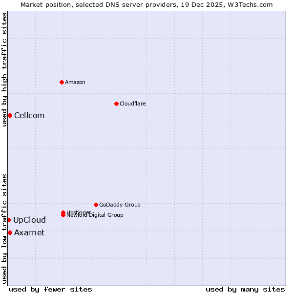 TechnologiesContent ManagementServer-side Languages Client-side Languages JavaScript Libraries CSS Frameworks Web Servers Web Panels Operating Systems Web Hosting Data Centers Reverse Proxies DNS Servers Email Servers SSL Certificate Authorities Content Delivery Traffic Analysis Tools Advertising Networks Tag Managers Social Widgets Site Elements Structured Data Markup Languages Character Encodings Image File Formats Top Level Domains Server Locations Content Languages | Technologies > DNS Servers > Technology usage comparison Comparison of the usage statistics of Axarnet vs. Cellcom vs. UpCloud for websitesThis report shows the usage statistics of Axarnet vs. Cellcom vs. UpCloud as DNS server provider on the web. See technologies overview for explanations on the methodologies used in the surveys. Our reports are updated daily. UsageThis diagram shows the percentages of websites using the selected technologies. How to read the diagram: