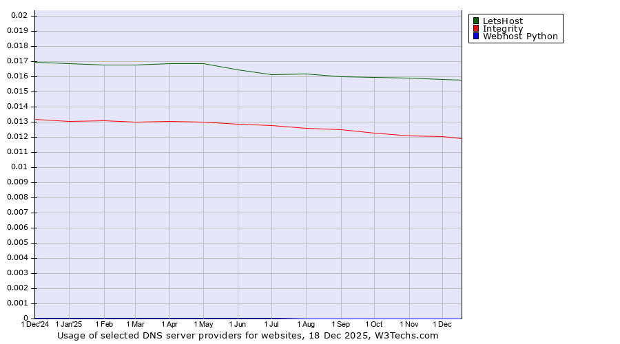 TechnologiesContent ManagementServer-side Languages Client-side Languages JavaScript Libraries CSS Frameworks Web Servers Web Panels Operating Systems Web Hosting Data Centers Reverse Proxies DNS Servers Email Servers SSL Certificate Authorities Content Delivery Traffic Analysis Tools Advertising Networks Tag Managers Social Widgets Site Elements Structured Data Markup Languages Character Encodings Image File Formats Top Level Domains Server Locations Content Languages | Technologies > DNS Servers > Technology usage comparison Comparison of the usage statistics of LetsHost vs. Integrity vs. Webhost Python for websitesThis report shows the usage statistics of LetsHost vs. Integrity vs. Webhost Python as DNS server provider on the web. See technologies overview for explanations on the methodologies used in the surveys. Our reports are updated daily. UsageThis diagram shows the percentages of websites using the selected technologies. How to read the diagram: