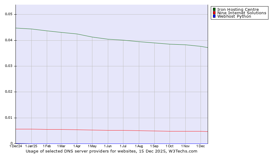 TechnologiesContent ManagementServer-side Languages Client-side Languages JavaScript Libraries CSS Frameworks Web Servers Web Panels Operating Systems Web Hosting Data Centers Reverse Proxies DNS Servers Email Servers SSL Certificate Authorities Content Delivery Traffic Analysis Tools Advertising Networks Tag Managers Social Widgets Site Elements Structured Data Markup Languages Character Encodings Image File Formats Top Level Domains Server Locations Content Languages | Technologies > DNS Servers > Technology usage comparison Comparison of the usage statistics of Iron Hosting Centre vs. Nine Internet Solutions vs. Webhost Python for websitesThis report shows the usage statistics of Iron Hosting Centre vs. Nine Internet Solutions vs. Webhost Python as DNS server provider on the web. See technologies overview for explanations on the methodologies used in the surveys. Our reports are updated daily. UsageThis diagram shows the percentages of websites using the selected technologies. How to read the diagram: