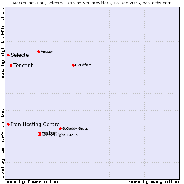 TechnologiesContent ManagementServer-side Languages Client-side Languages JavaScript Libraries CSS Frameworks Web Servers Web Panels Operating Systems Web Hosting Data Centers Reverse Proxies DNS Servers Email Servers SSL Certificate Authorities Content Delivery Traffic Analysis Tools Advertising Networks Tag Managers Social Widgets Site Elements Structured Data Markup Languages Character Encodings Image File Formats Top Level Domains Server Locations Content Languages | Technologies > DNS Servers > Technology usage comparison Comparison of the usage statistics of Tencent vs. Selectel vs. Iron Hosting Centre for websitesThis report shows the usage statistics of Tencent vs. Selectel vs. Iron Hosting Centre as DNS server provider on the web. See technologies overview for explanations on the methodologies used in the surveys. Our reports are updated daily. UsageThis diagram shows the percentages of websites using the selected technologies. How to read the diagram:
