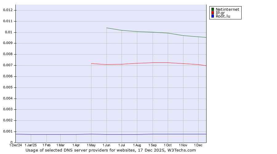TechnologiesContent ManagementServer-side Languages Client-side Languages JavaScript Libraries CSS Frameworks Web Servers Web Panels Operating Systems Web Hosting Data Centers Reverse Proxies DNS Servers Email Servers SSL Certificate Authorities Content Delivery Traffic Analysis Tools Advertising Networks Tag Managers Social Widgets Site Elements Structured Data Markup Languages Character Encodings Image File Formats Top Level Domains Server Locations Content Languages | Technologies > DNS Servers > Technology usage comparison Comparison of the usage statistics of Netinternet vs. IP.gr vs. Root.lu for websitesThis report shows the usage statistics of Netinternet vs. IP.gr vs. Root.lu as DNS server provider on the web. See technologies overview for explanations on the methodologies used in the surveys. Our reports are updated daily. UsageThis diagram shows the percentages of websites using the selected technologies. How to read the diagram: