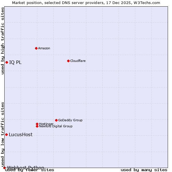 TechnologiesContent ManagementServer-side Languages Client-side Languages JavaScript Libraries CSS Frameworks Web Servers Web Panels Operating Systems Web Hosting Data Centers Reverse Proxies DNS Servers Email Servers SSL Certificate Authorities Content Delivery Traffic Analysis Tools Advertising Networks Tag Managers Social Widgets Site Elements Structured Data Markup Languages Character Encodings Image File Formats Top Level Domains Server Locations Content Languages | Technologies > DNS Servers > Technology usage comparison Comparison of the usage statistics of IQ PL vs. LucusHost vs. Webhost Python for websitesThis report shows the usage statistics of IQ PL vs. LucusHost vs. Webhost Python as DNS server provider on the web. See technologies overview for explanations on the methodologies used in the surveys. Our reports are updated daily. UsageThis diagram shows the percentages of websites using the selected technologies. How to read the diagram: