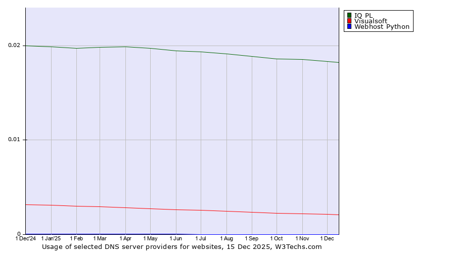 TechnologiesContent ManagementServer-side Languages Client-side Languages JavaScript Libraries CSS Frameworks Web Servers Web Panels Operating Systems Web Hosting Data Centers Reverse Proxies DNS Servers Email Servers SSL Certificate Authorities Content Delivery Traffic Analysis Tools Advertising Networks Tag Managers Social Widgets Site Elements Structured Data Markup Languages Character Encodings Image File Formats Top Level Domains Server Locations Content Languages | Technologies > DNS Servers > Technology usage comparison Comparison of the usage statistics of IQ PL vs. Visualsoft vs. Webhost Python for websitesThis report shows the usage statistics of IQ PL vs. Visualsoft vs. Webhost Python as DNS server provider on the web. See technologies overview for explanations on the methodologies used in the surveys. Our reports are updated daily. UsageThis diagram shows the percentages of websites using the selected technologies. How to read the diagram: