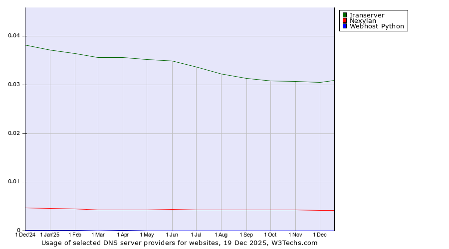 TechnologiesContent ManagementServer-side Languages Client-side Languages JavaScript Libraries CSS Frameworks Web Servers Web Panels Operating Systems Web Hosting Data Centers Reverse Proxies DNS Servers Email Servers SSL Certificate Authorities Content Delivery Traffic Analysis Tools Advertising Networks Tag Managers Social Widgets Site Elements Structured Data Markup Languages Character Encodings Image File Formats Top Level Domains Server Locations Content Languages | Technologies > DNS Servers > Technology usage comparison Comparison of the usage statistics of Iranserver vs. Nexylan vs. Webhost Python for websitesThis report shows the usage statistics of Iranserver vs. Nexylan vs. Webhost Python as DNS server provider on the web. See technologies overview for explanations on the methodologies used in the surveys. Our reports are updated daily. UsageThis diagram shows the percentages of websites using the selected technologies. How to read the diagram: