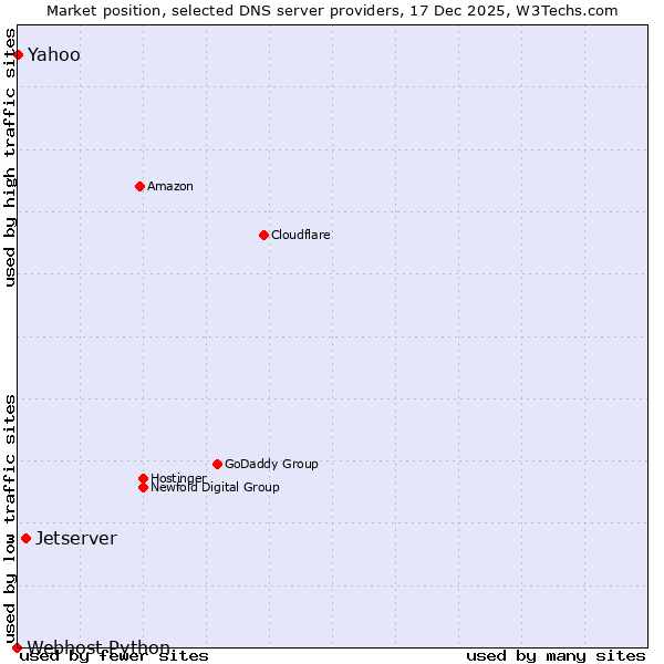 TechnologiesContent ManagementServer-side Languages Client-side Languages JavaScript Libraries CSS Frameworks Web Servers Web Panels Operating Systems Web Hosting Data Centers Reverse Proxies DNS Servers Email Servers SSL Certificate Authorities Content Delivery Traffic Analysis Tools Advertising Networks Tag Managers Social Widgets Site Elements Structured Data Markup Languages Character Encodings Image File Formats Top Level Domains Server Locations Content Languages | Technologies > DNS Servers > Technology usage comparison Comparison of the usage statistics of Jetserver vs. Yahoo vs. Webhost Python for websitesThis report shows the usage statistics of Jetserver vs. Yahoo vs. Webhost Python as DNS server provider on the web. See technologies overview for explanations on the methodologies used in the surveys. Our reports are updated daily. UsageThis diagram shows the percentages of websites using the selected technologies. How to read the diagram: