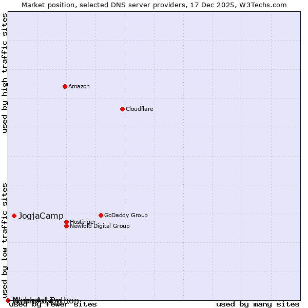 TechnologiesContent ManagementServer-side Languages Client-side Languages JavaScript Libraries CSS Frameworks Web Servers Web Panels Operating Systems Web Hosting Data Centers Reverse Proxies DNS Servers Email Servers SSL Certificate Authorities Content Delivery Traffic Analysis Tools Advertising Networks Tag Managers Social Widgets Site Elements Structured Data Markup Languages Character Encodings Image File Formats Top Level Domains Server Locations Content Languages | Technologies > DNS Servers > Technology usage comparison Comparison of the usage statistics of JogjaCamp vs. NameAction vs. Webhost Python for websitesThis report shows the usage statistics of JogjaCamp vs. NameAction vs. Webhost Python as DNS server provider on the web. See technologies overview for explanations on the methodologies used in the surveys. Our reports are updated daily. UsageThis diagram shows the percentages of websites using the selected technologies. How to read the diagram: