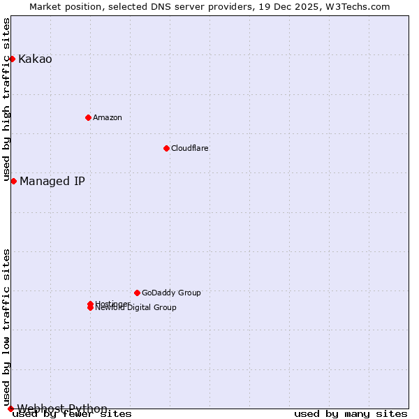TechnologiesContent ManagementServer-side Languages Client-side Languages JavaScript Libraries CSS Frameworks Web Servers Web Panels Operating Systems Web Hosting Data Centers Reverse Proxies DNS Servers Email Servers SSL Certificate Authorities Content Delivery Traffic Analysis Tools Advertising Networks Tag Managers Social Widgets Site Elements Structured Data Markup Languages Character Encodings Image File Formats Top Level Domains Server Locations Content Languages | Technologies > DNS Servers > Technology usage comparison Comparison of the usage statistics of Managed IP vs. Kakao vs. Webhost Python for websitesThis report shows the usage statistics of Managed IP vs. Kakao vs. Webhost Python as DNS server provider on the web. See technologies overview for explanations on the methodologies used in the surveys. Our reports are updated daily. UsageThis diagram shows the percentages of websites using the selected technologies. How to read the diagram: