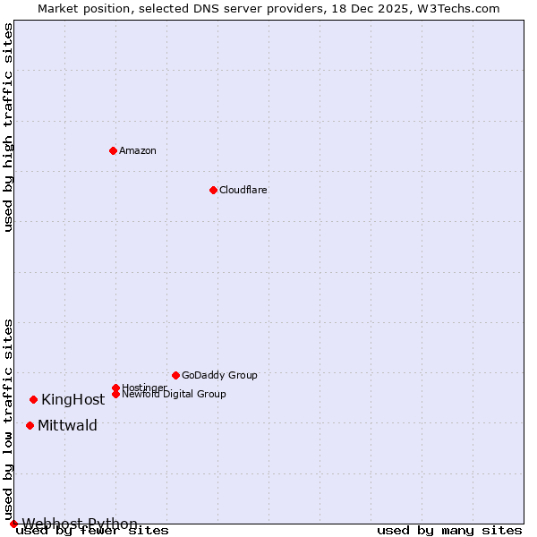 TechnologiesContent ManagementServer-side Languages Client-side Languages JavaScript Libraries CSS Frameworks Web Servers Web Panels Operating Systems Web Hosting Data Centers Reverse Proxies DNS Servers Email Servers SSL Certificate Authorities Content Delivery Traffic Analysis Tools Advertising Networks Tag Managers Social Widgets Site Elements Structured Data Markup Languages Character Encodings Image File Formats Top Level Domains Server Locations Content Languages | Technologies > DNS Servers > Technology usage comparison Comparison of the usage statistics of KingHost vs. Mittwald vs. Webhost Python for websitesThis report shows the usage statistics of KingHost vs. Mittwald vs. Webhost Python as DNS server provider on the web. See technologies overview for explanations on the methodologies used in the surveys. Our reports are updated daily. UsageThis diagram shows the percentages of websites using the selected technologies. How to read the diagram: