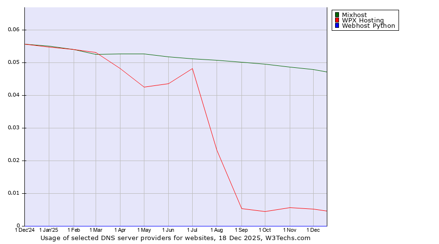 TechnologiesContent ManagementServer-side Languages Client-side Languages JavaScript Libraries CSS Frameworks Web Servers Web Panels Operating Systems Web Hosting Data Centers Reverse Proxies DNS Servers Email Servers SSL Certificate Authorities Content Delivery Traffic Analysis Tools Advertising Networks Tag Managers Social Widgets Site Elements Structured Data Markup Languages Character Encodings Image File Formats Top Level Domains Server Locations Content Languages | Technologies > DNS Servers > Technology usage comparison Comparison of the usage statistics of Mixhost vs. WPX Hosting vs. Webhost Python for websitesThis report shows the usage statistics of Mixhost vs. WPX Hosting vs. Webhost Python as DNS server provider on the web. See technologies overview for explanations on the methodologies used in the surveys. Our reports are updated daily. UsageThis diagram shows the percentages of websites using the selected technologies. How to read the diagram: