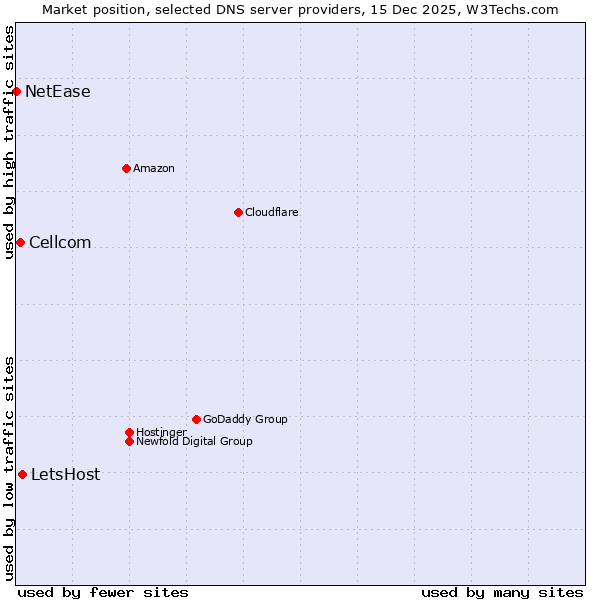 TechnologiesContent ManagementServer-side Languages Client-side Languages JavaScript Libraries CSS Frameworks Web Servers Web Panels Operating Systems Web Hosting Data Centers Reverse Proxies DNS Servers Email Servers SSL Certificate Authorities Content Delivery Traffic Analysis Tools Advertising Networks Tag Managers Social Widgets Site Elements Structured Data Markup Languages Character Encodings Image File Formats Top Level Domains Server Locations Content Languages | Technologies > DNS Servers > Technology usage comparison Comparison of the usage statistics of LetsHost vs. Cellcom vs. NetEase for websitesThis report shows the usage statistics of LetsHost vs. Cellcom vs. NetEase as DNS server provider on the web. See technologies overview for explanations on the methodologies used in the surveys. Our reports are updated daily. UsageThis diagram shows the percentages of websites using the selected technologies. How to read the diagram: