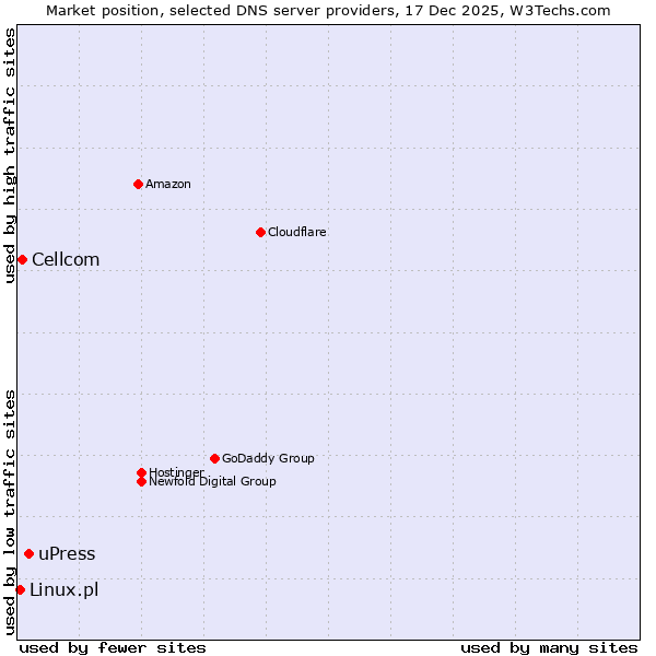 TechnologiesContent ManagementServer-side Languages Client-side Languages JavaScript Libraries CSS Frameworks Web Servers Web Panels Operating Systems Web Hosting Data Centers Reverse Proxies DNS Servers Email Servers SSL Certificate Authorities Content Delivery Traffic Analysis Tools Advertising Networks Tag Managers Social Widgets Site Elements Structured Data Markup Languages Character Encodings Image File Formats Top Level Domains Server Locations Content Languages | Technologies > DNS Servers > Technology usage comparison Comparison of the usage statistics of uPress vs. Cellcom vs. Linux.pl for websitesThis report shows the usage statistics of uPress vs. Cellcom vs. Linux.pl as DNS server provider on the web. See technologies overview for explanations on the methodologies used in the surveys. Our reports are updated daily. UsageThis diagram shows the percentages of websites using the selected technologies. How to read the diagram: