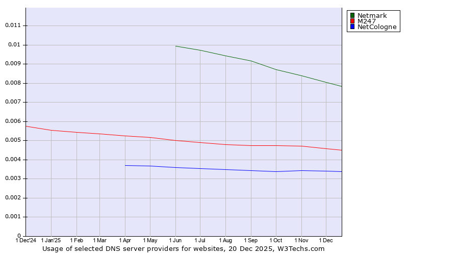 TechnologiesContent ManagementServer-side Languages Client-side Languages JavaScript Libraries CSS Frameworks Web Servers Web Panels Operating Systems Web Hosting Data Centers Reverse Proxies DNS Servers Email Servers SSL Certificate Authorities Content Delivery Traffic Analysis Tools Advertising Networks Tag Managers Social Widgets Site Elements Structured Data Markup Languages Character Encodings Image File Formats Top Level Domains Server Locations Content Languages | Technologies > DNS Servers > Technology usage comparison Comparison of the usage statistics of Netmark vs. M247 vs. NetCologne for websitesThis report shows the usage statistics of Netmark vs. M247 vs. NetCologne as DNS server provider on the web. See technologies overview for explanations on the methodologies used in the surveys. Our reports are updated daily. UsageThis diagram shows the percentages of websites using the selected technologies. How to read the diagram: