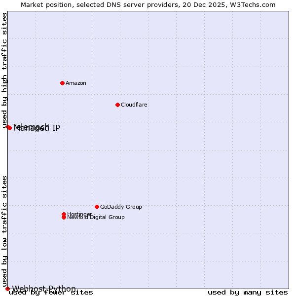 TechnologiesContent ManagementServer-side Languages Client-side Languages JavaScript Libraries CSS Frameworks Web Servers Web Panels Operating Systems Web Hosting Data Centers Reverse Proxies DNS Servers Email Servers SSL Certificate Authorities Content Delivery Traffic Analysis Tools Advertising Networks Tag Managers Social Widgets Site Elements Structured Data Markup Languages Character Encodings Image File Formats Top Level Domains Server Locations Content Languages | Technologies > DNS Servers > Technology usage comparison Comparison of the usage statistics of Managed IP vs. Telemach vs. Webhost Python for websitesThis report shows the usage statistics of Managed IP vs. Telemach vs. Webhost Python as DNS server provider on the web. See technologies overview for explanations on the methodologies used in the surveys. Our reports are updated daily. UsageThis diagram shows the percentages of websites using the selected technologies. How to read the diagram: