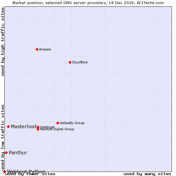 TechnologiesContent ManagementServer-side Languages Client-side Languages JavaScript Libraries CSS Frameworks Web Servers Web Panels Operating Systems Web Hosting Data Centers Reverse Proxies DNS Servers Email Servers SSL Certificate Authorities Content Delivery Traffic Analysis Tools Advertising Networks Tag Managers Social Widgets Site Elements Structured Data Markup Languages Character Encodings Image File Formats Top Level Domains Server Locations Content Languages | Technologies > DNS Servers > Technology usage comparison Comparison of the usage statistics of Masterhost vs. Panthur vs. Webhost Python for websitesThis report shows the usage statistics of Masterhost vs. Panthur vs. Webhost Python as DNS server provider on the web. See technologies overview for explanations on the methodologies used in the surveys. Our reports are updated daily. UsageThis diagram shows the percentages of websites using the selected technologies. How to read the diagram: