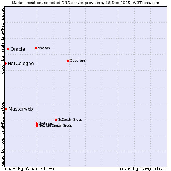 TechnologiesContent ManagementServer-side Languages Client-side Languages JavaScript Libraries CSS Frameworks Web Servers Web Panels Operating Systems Web Hosting Data Centers Reverse Proxies DNS Servers Email Servers SSL Certificate Authorities Content Delivery Traffic Analysis Tools Advertising Networks Tag Managers Social Widgets Site Elements Structured Data Markup Languages Character Encodings Image File Formats Top Level Domains Server Locations Content Languages | Technologies > DNS Servers > Technology usage comparison Comparison of the usage statistics of Oracle vs. Masterweb vs. NetCologne for websitesThis report shows the usage statistics of Oracle vs. Masterweb vs. NetCologne as DNS server provider on the web. See technologies overview for explanations on the methodologies used in the surveys. Our reports are updated daily. UsageThis diagram shows the percentages of websites using the selected technologies. How to read the diagram: