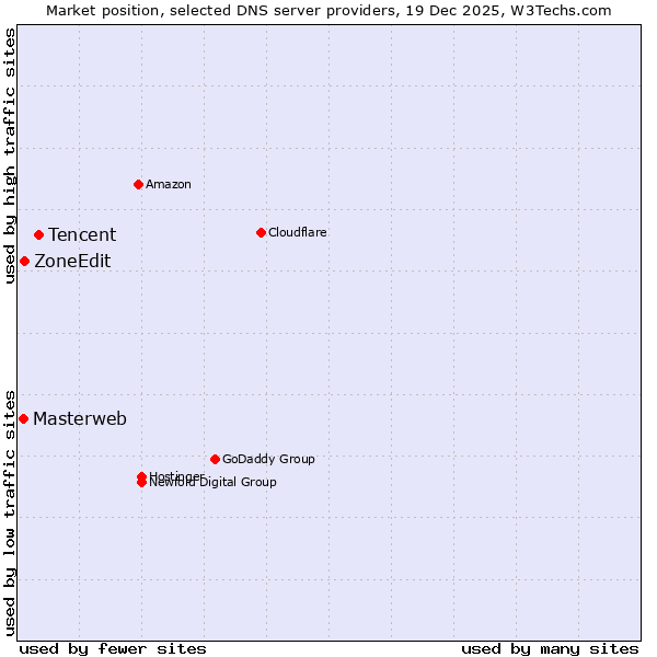TechnologiesContent ManagementServer-side Languages Client-side Languages JavaScript Libraries CSS Frameworks Web Servers Web Panels Operating Systems Web Hosting Data Centers Reverse Proxies DNS Servers Email Servers SSL Certificate Authorities Content Delivery Traffic Analysis Tools Advertising Networks Tag Managers Social Widgets Site Elements Structured Data Markup Languages Character Encodings Image File Formats Top Level Domains Server Locations Content Languages | Technologies > DNS Servers > Technology usage comparison Comparison of the usage statistics of Tencent vs. ZoneEdit vs. Masterweb for websitesThis report shows the usage statistics of Tencent vs. ZoneEdit vs. Masterweb as DNS server provider on the web. See technologies overview for explanations on the methodologies used in the surveys. Our reports are updated daily. UsageThis diagram shows the percentages of websites using the selected technologies. How to read the diagram: