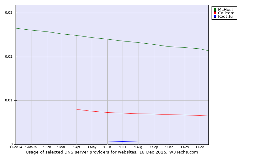TechnologiesContent ManagementServer-side Languages Client-side Languages JavaScript Libraries CSS Frameworks Web Servers Web Panels Operating Systems Web Hosting Data Centers Reverse Proxies DNS Servers Email Servers SSL Certificate Authorities Content Delivery Traffic Analysis Tools Advertising Networks Tag Managers Social Widgets Site Elements Structured Data Markup Languages Character Encodings Image File Formats Top Level Domains Server Locations Content Languages | Technologies > DNS Servers > Technology usage comparison Comparison of the usage statistics of McHost vs. Cellcom vs. Root.lu for websitesThis report shows the usage statistics of McHost vs. Cellcom vs. Root.lu as DNS server provider on the web. See technologies overview for explanations on the methodologies used in the surveys. Our reports are updated daily. UsageThis diagram shows the percentages of websites using the selected technologies. How to read the diagram: