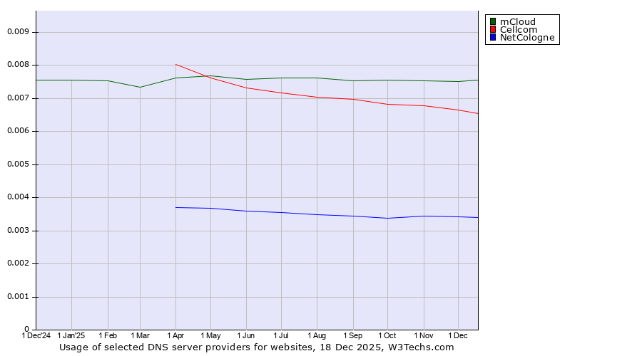 TechnologiesContent ManagementServer-side Languages Client-side Languages JavaScript Libraries CSS Frameworks Web Servers Web Panels Operating Systems Web Hosting Data Centers Reverse Proxies DNS Servers Email Servers SSL Certificate Authorities Content Delivery Traffic Analysis Tools Advertising Networks Tag Managers Social Widgets Site Elements Structured Data Markup Languages Character Encodings Image File Formats Top Level Domains Server Locations Content Languages | Technologies > DNS Servers > Technology usage comparison Comparison of the usage statistics of mCloud vs. Cellcom vs. NetCologne for websitesThis report shows the usage statistics of mCloud vs. Cellcom vs. NetCologne as DNS server provider on the web. See technologies overview for explanations on the methodologies used in the surveys. Our reports are updated daily. UsageThis diagram shows the percentages of websites using the selected technologies. How to read the diagram: