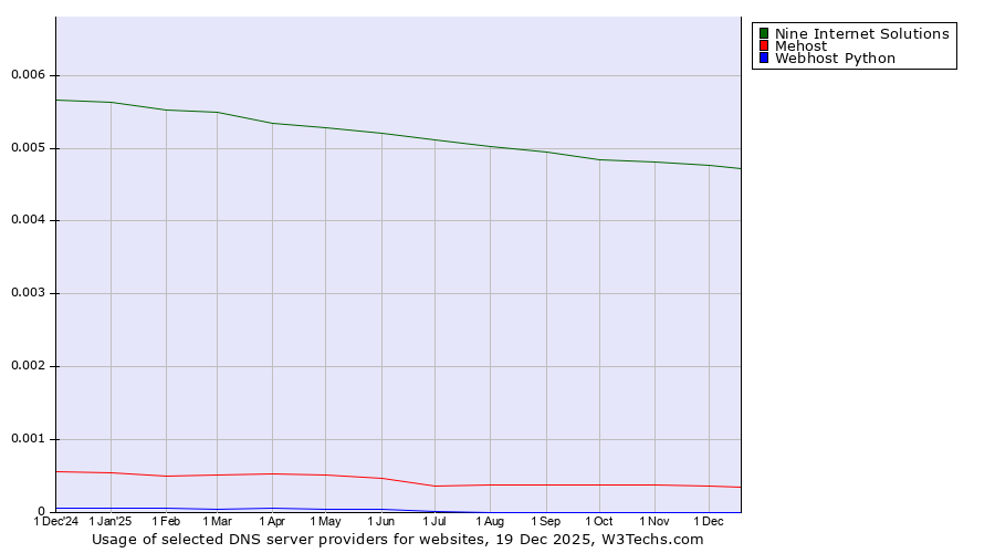 TechnologiesContent ManagementServer-side Languages Client-side Languages JavaScript Libraries CSS Frameworks Web Servers Web Panels Operating Systems Web Hosting Data Centers Reverse Proxies DNS Servers Email Servers SSL Certificate Authorities Content Delivery Traffic Analysis Tools Advertising Networks Tag Managers Social Widgets Site Elements Structured Data Markup Languages Character Encodings Image File Formats Top Level Domains Server Locations Content Languages | Technologies > DNS Servers > Technology usage comparison Comparison of the usage statistics of Nine Internet Solutions vs. Mehost vs. Webhost Python for websitesThis report shows the usage statistics of Nine Internet Solutions vs. Mehost vs. Webhost Python as DNS server provider on the web. See technologies overview for explanations on the methodologies used in the surveys. Our reports are updated daily. UsageThis diagram shows the percentages of websites using the selected technologies. How to read the diagram: