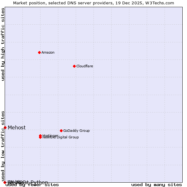 TechnologiesContent ManagementServer-side Languages Client-side Languages JavaScript Libraries CSS Frameworks Web Servers Web Panels Operating Systems Web Hosting Data Centers Reverse Proxies DNS Servers Email Servers SSL Certificate Authorities Content Delivery Traffic Analysis Tools Advertising Networks Tag Managers Social Widgets Site Elements Structured Data Markup Languages Character Encodings Image File Formats Top Level Domains Server Locations Content Languages | Technologies > DNS Servers > Technology usage comparison Comparison of the usage statistics of Mehost vs. SK-NIC vs. Webhost Python for websitesThis report shows the usage statistics of Mehost vs. SK-NIC vs. Webhost Python as DNS server provider on the web. See technologies overview for explanations on the methodologies used in the surveys. Our reports are updated daily. UsageThis diagram shows the percentages of websites using the selected technologies. How to read the diagram: