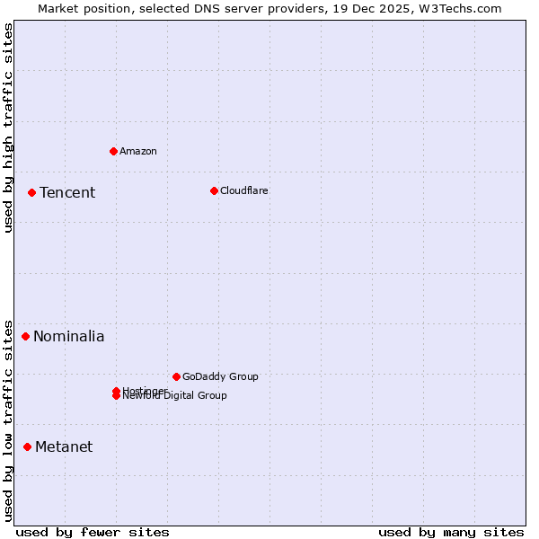 TechnologiesContent ManagementServer-side Languages Client-side Languages JavaScript Libraries CSS Frameworks Web Servers Web Panels Operating Systems Web Hosting Data Centers Reverse Proxies DNS Servers Email Servers SSL Certificate Authorities Content Delivery Traffic Analysis Tools Advertising Networks Tag Managers Social Widgets Site Elements Structured Data Markup Languages Character Encodings Image File Formats Top Level Domains Server Locations Content Languages | Technologies > DNS Servers > Technology usage comparison Comparison of the usage statistics of Tencent vs. Metanet vs. Nominalia for websitesThis report shows the usage statistics of Tencent vs. Metanet vs. Nominalia as DNS server provider on the web. See technologies overview for explanations on the methodologies used in the surveys. Our reports are updated daily. UsageThis diagram shows the percentages of websites using the selected technologies. How to read the diagram: