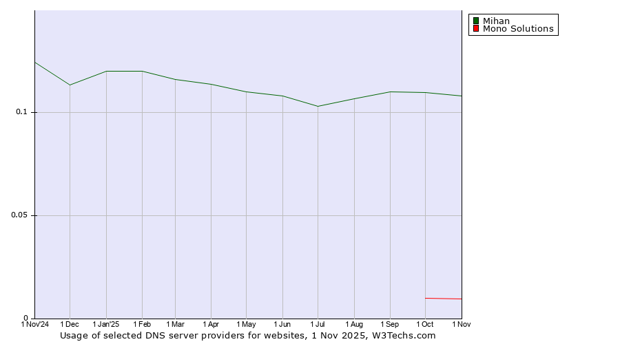 TechnologiesContent ManagementServer-side Languages Client-side Languages JavaScript Libraries CSS Frameworks Web Servers Web Panels Operating Systems Web Hosting Data Centers Reverse Proxies DNS Servers Email Servers SSL Certificate Authorities Content Delivery Traffic Analysis Tools Advertising Networks Tag Managers Social Widgets Site Elements Structured Data Markup Languages Character Encodings Image File Formats Top Level Domains Server Locations Content Languages ComparisonCompare with other | Technologies > DNS Servers > Technology usage comparison Comparison of the usage statistics of Mihan vs. Mono Solutions for websitesThis report shows the usage statistics of Mihan vs. Mono Solutions as DNS server provider on the web. See technologies overview for explanations on the methodologies used in the surveys. Our reports are updated daily. UsageThis diagram shows the percentages of websites using the selected technologies. How to read the diagram: