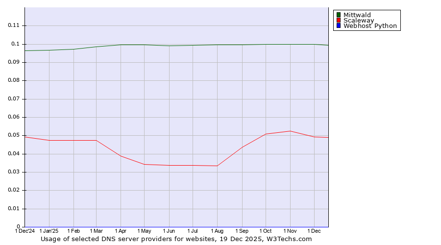 TechnologiesContent ManagementServer-side Languages Client-side Languages JavaScript Libraries CSS Frameworks Web Servers Web Panels Operating Systems Web Hosting Data Centers Reverse Proxies DNS Servers Email Servers SSL Certificate Authorities Content Delivery Traffic Analysis Tools Advertising Networks Tag Managers Social Widgets Site Elements Structured Data Markup Languages Character Encodings Image File Formats Top Level Domains Server Locations Content Languages | Technologies > DNS Servers > Technology usage comparison Comparison of the usage statistics of Mittwald vs. Scaleway vs. Webhost Python for websitesThis report shows the usage statistics of Mittwald vs. Scaleway vs. Webhost Python as DNS server provider on the web. See technologies overview for explanations on the methodologies used in the surveys. Our reports are updated daily. UsageThis diagram shows the percentages of websites using the selected technologies. How to read the diagram: