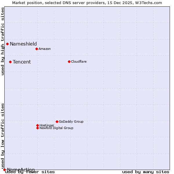 TechnologiesContent ManagementServer-side Languages Client-side Languages JavaScript Libraries CSS Frameworks Web Servers Web Panels Operating Systems Web Hosting Data Centers Reverse Proxies DNS Servers Email Servers SSL Certificate Authorities Content Delivery Traffic Analysis Tools Advertising Networks Tag Managers Social Widgets Site Elements Structured Data Markup Languages Character Encodings Image File Formats Top Level Domains Server Locations Content Languages | Technologies > DNS Servers > Technology usage comparison Comparison of the usage statistics of Tencent vs. Nameshield vs. NameAction for websitesThis report shows the usage statistics of Tencent vs. Nameshield vs. NameAction as DNS server provider on the web. See technologies overview for explanations on the methodologies used in the surveys. Our reports are updated daily. UsageThis diagram shows the percentages of websites using the selected technologies. How to read the diagram: