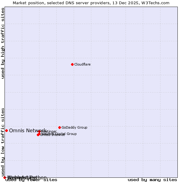 TechnologiesContent ManagementServer-side Languages Client-side Languages JavaScript Libraries CSS Frameworks Web Servers Web Panels Operating Systems Web Hosting Data Centers Reverse Proxies DNS Servers Email Servers SSL Certificate Authorities Content Delivery Traffic Analysis Tools Advertising Networks Tag Managers Social Widgets Site Elements Structured Data Markup Languages Character Encodings Image File Formats Top Level Domains Server Locations Content Languages | Technologies > DNS Servers > Technology usage comparison Comparison of the usage statistics of Omnis Network vs. NameAction vs. Webhost Python for websitesThis report shows the usage statistics of Omnis Network vs. NameAction vs. Webhost Python as DNS server provider on the web. See technologies overview for explanations on the methodologies used in the surveys. Our reports are updated daily. UsageThis diagram shows the percentages of websites using the selected technologies. How to read the diagram: