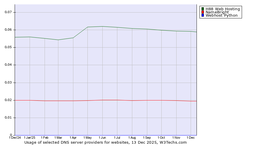 TechnologiesContent ManagementServer-side Languages Client-side Languages JavaScript Libraries CSS Frameworks Web Servers Web Panels Operating Systems Web Hosting Data Centers Reverse Proxies DNS Servers Email Servers SSL Certificate Authorities Content Delivery Traffic Analysis Tools Advertising Networks Tag Managers Social Widgets Site Elements Structured Data Markup Languages Character Encodings Image File Formats Top Level Domains Server Locations Content Languages | Technologies > DNS Servers > Technology usage comparison Comparison of the usage statistics of H88 Web Hosting vs. NameBright vs. Webhost Python for websitesThis report shows the usage statistics of H88 Web Hosting vs. NameBright vs. Webhost Python as DNS server provider on the web. See technologies overview for explanations on the methodologies used in the surveys. Our reports are updated daily. UsageThis diagram shows the percentages of websites using the selected technologies. How to read the diagram: