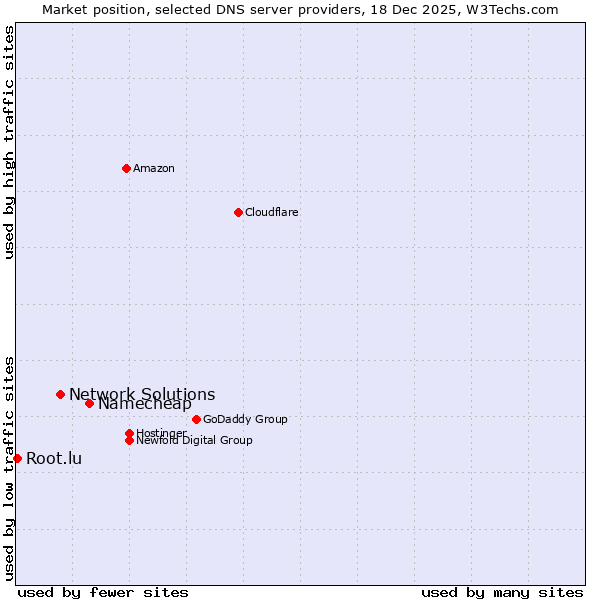 TechnologiesContent ManagementServer-side Languages Client-side Languages JavaScript Libraries CSS Frameworks Web Servers Web Panels Operating Systems Web Hosting Data Centers Reverse Proxies DNS Servers Email Servers SSL Certificate Authorities Content Delivery Traffic Analysis Tools Advertising Networks Tag Managers Social Widgets Site Elements Structured Data Markup Languages Character Encodings Image File Formats Top Level Domains Server Locations Content Languages | Technologies > DNS Servers > Technology usage comparison Comparison of the usage statistics of Namecheap vs. Network Solutions vs. Root.lu for websitesThis report shows the usage statistics of Namecheap vs. Network Solutions vs. Root.lu as DNS server provider on the web. See technologies overview for explanations on the methodologies used in the surveys. Our reports are updated daily. UsageThis diagram shows the percentages of websites using the selected technologies. How to read the diagram: